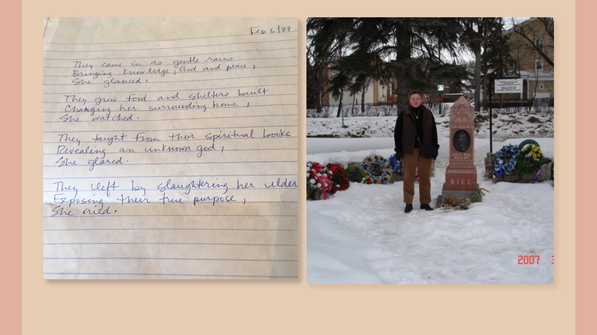 One of the assignments we had to complete was to write something – e.g. letter, poem, news article, etc. – reflecting what it was like to be living during that time in Canadian society. I chose to write a poem from the point of view of a young indigenous woman, 18 years of age – the same age as I was then.